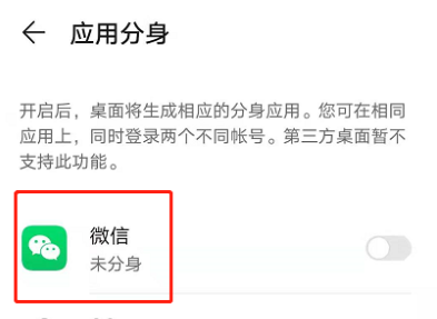 第三步、小编以微信举例,开启微信的应用分身