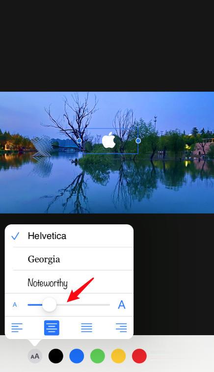 3、将文本框放在合适的位置,用苹果自带的输入法,输入苹果,选择logo图标,调整颜色,点击AA调整大小